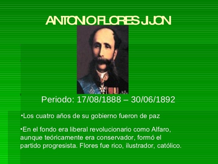 Concluido el mandato de José María Plácido Caamaño, y con su apoyo, fue elegido un nuevo presidente en Ecuador para el período de 1888 a 1892. Este nuevo mandatario era Antonio Flores Jijón, hijo del primer presidente de la nación como república, Juan José Flores, así como el antiguo colaborador de Gabriel García Moreno.